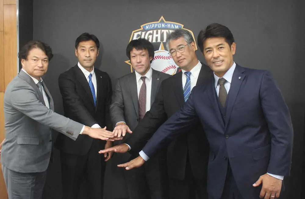 2軍コーチ就任会見でポーズをとる(右から)日本ハム・稲葉GM、木田2軍監督、多田野投手コーチ、伊藤育成コーディネーター兼投手コーチ、川名育成コーチ