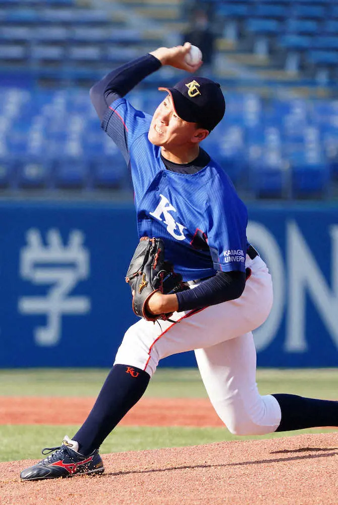 神奈川大は2―1で龍谷大に競り勝った。来秋のドラフト候補に挙がる最速152キロ右腕・神野竜速(りゅうどう=3年)は先発し、6回3安打1失点で勝利に導いた。