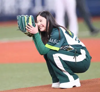 吉高は2017年の日本シリーズ第2戦でも始球式を行っており、当時は捕手のミットにゴロで収さまる投球で不完全燃焼。4年ぶり“登板”となった今回もSMBCのコーポレートカラーである緑のユニホーム風衣装を身にまとい登場するも、リリース時に指を引っ掛けてしまい大暴投。打者・塩見の後ろをコロコロと転がりながらボールが通過すると、吉高はグラブで顔を覆いながらしゃがみ込んで恥ずかしそうに悔しがった。