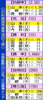 ▽沢村賞 正式には「沢村栄治賞」。史上初の無安打無得点試合を達成した伝説の大投手、故沢村栄治氏(巨人)を記念し、1リーグ時代の1947年に制定された。シーズンで最も優れた先発完投型の投手に贈られる賞で、2リーグ分立の50年からはセ・リーグの所属投手だけが選考対象、89年から両リーグに広げられた。当初は記者投票、82年から受賞経験者らによる選考委員会で選出している。