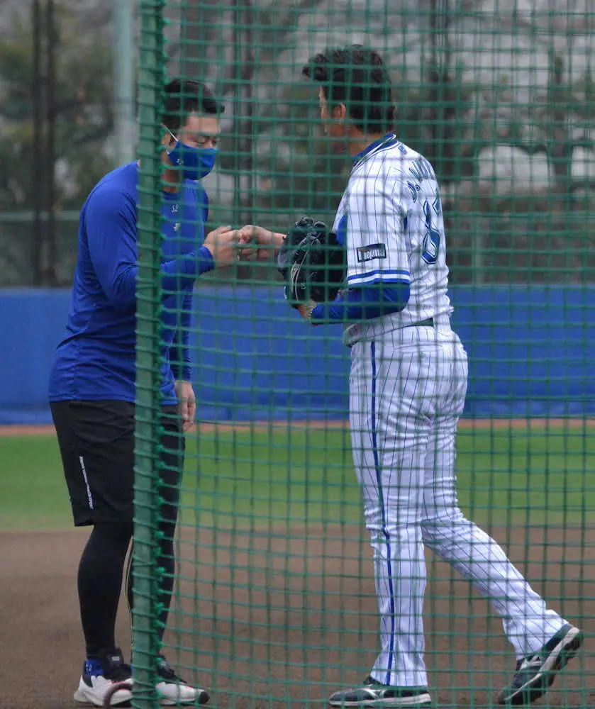 米国から帰国し21日にDeNA・三浦監督(右)にあいさつする細川