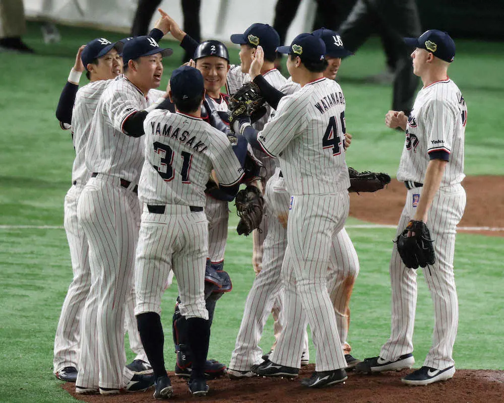 <ヤ・オ>勝利しハイタッチする中村(左から4人目)らヤクルトナイン(撮影・大森 寛明)
