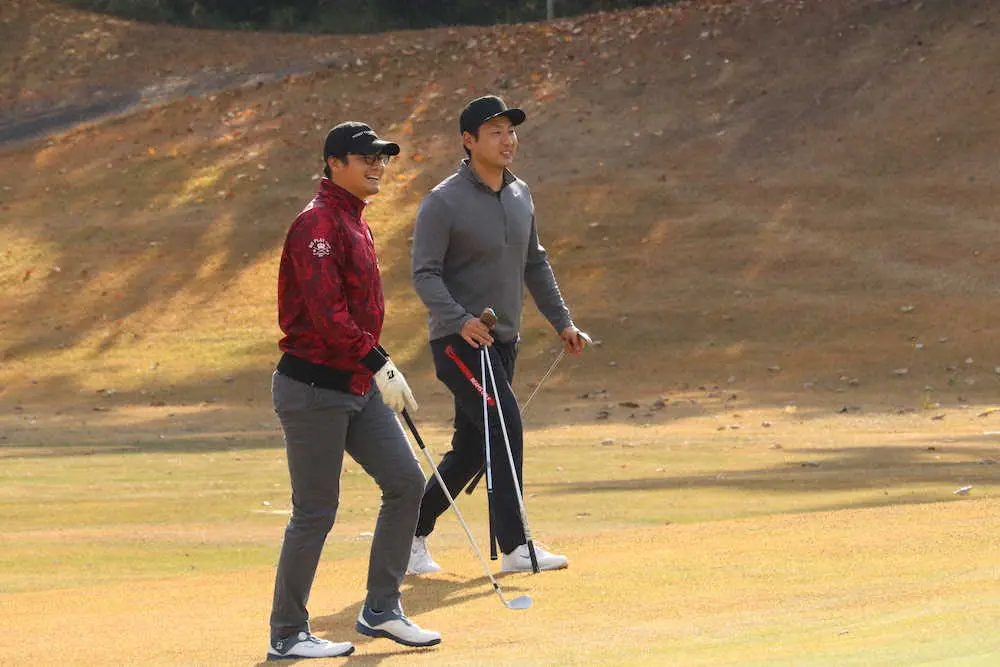 選手会ゴルフに参加する戸田(左)と今村(撮影・河合 洋介)