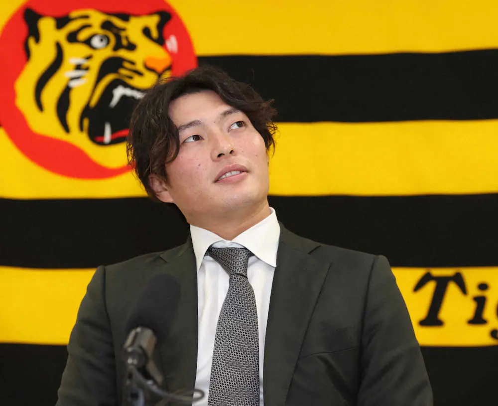 契約更改を終え、会見に臨む阪神・北條(代表撮影)