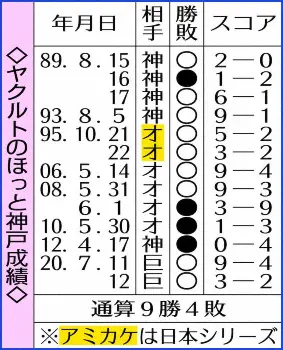 《ほっと神戸のヤクルト勝率・692》ヤクルトがほっと神戸で試合を行うのは、20年7月11、12日の巨人戦以来。当時は新型コロナウイルス対策で移動を極力減らした日程に再編されており、巨人の主催試合として行われた。88年開場の同球場で、これまでレギュラーシーズンの試合は11試合、日本シリーズを含めても13試合しか経験はない。9勝4敗で勝率・692と、高い数字を残している。