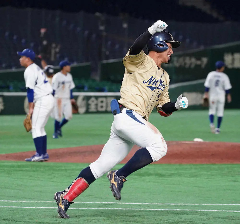 1点を追う9回。NTT西日本は平良の左前適時打で同点とし、さらに1死満塁の好機を迎えて4番・野村に打席が回った。「熱くなる場面でしたけど(大原周作)監督から“落ち着いて、冷静に”と(言われた)。自分を信じていった」。初球の浮いたチェンジアップを左前へ。拓大時代以来のサヨナラ打に右手を突き上げた。