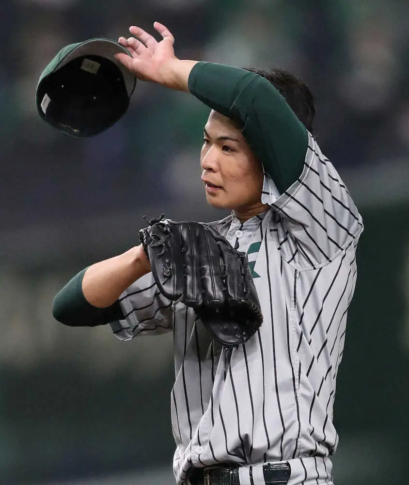 <JR東日本・Honda熊本>8回2死一、三塁、Honda熊本・持永に勝ち越し適時打を浴び汗をぬぐうJR東日本・山田(撮影・木村 揚輔)