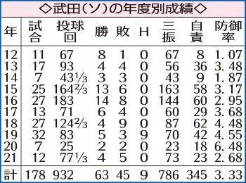 年明けの自主トレは地元・宮崎で行う予定。育成の岡本が「武田塾」に志願してきたことを明かし、「野球以前のことを叩き込もうかな」と笑った。来季、6年ぶりの2桁勝利を狙う背番号「18」は「まずはローテに入っていかないと。体をつくって、キャンプインに合わせたい」。バドミントン投法で新カーブを磨き上げる。(福井 亮太)