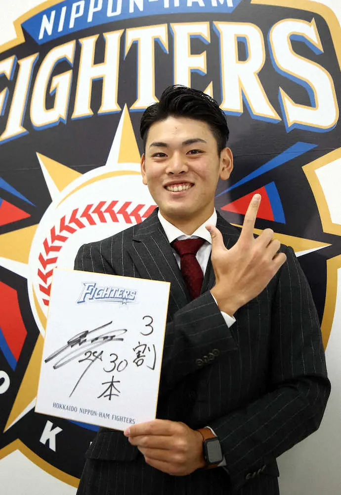 日本ハムの野村佑希内野手(21)が2日、札幌市内の球団事務所で契約更改交渉に臨み、1120万円増の年俸2000万円でサインした。侍ジャパンの監督に今季まで日本ハムで監督を務めた栗山英樹氏(60)が就任。アマ時代も含めて日本代表経験がない若き大砲は、栗山ジャパン入りを目指し、4年目の来季の飛躍を誓った。