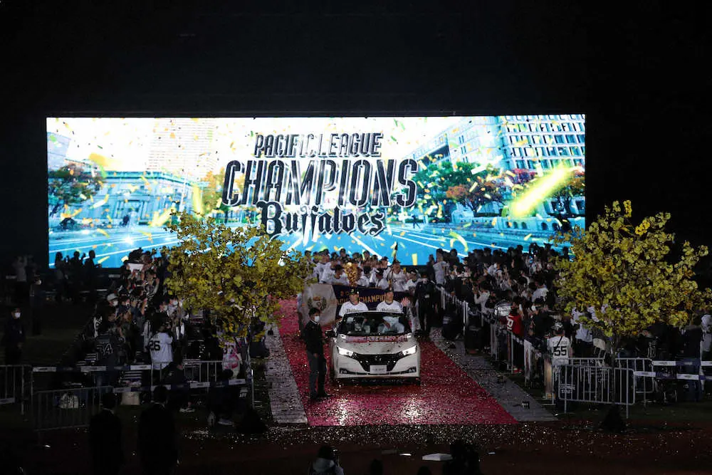 <オリックスファンフェスタ>京セラドーム内でバーチャル御堂筋パレードを行うオリックスナイン Photo by 代表撮影 オリックス 「ファン感」で御堂筋Vパレード バーチャルで実施 ギャラリーで見る この記事のフォト 2021年12月04日の画像一覧 もっと見る 2021年12月04日の画像をもっと見る