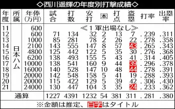 ◇西川 遥輝(にしかわ・はるき)1992年(平4)4月16日生まれ、和歌山県出身の29歳。智弁和歌山では甲子園に4度出場し、10年ドラフト2位で日本ハム入団。16年の日本シリーズでは第5戦で史上2人目の満塁サヨナラ弾を放ち、10年ぶりの日本一に貢献した。14、17、18、21年盗塁王、ベストナイン2度、ゴールデン・グラブ賞4度。球宴には2度出場。1メートル81、79キロ。右投げ左打ち。