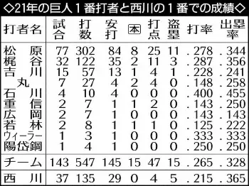 ≪固定できず10人起用≫今季、巨人で先発1番に起用されたのは77試合の松原を筆頭に10人いる。起用人数では広島と並ぶリーグ最多。1番の打率.265、出塁率.328はともにリーグ5位と苦しんだ。10試合以上の出場は松原の他に梶谷の32試合と吉川の15試合。1人の打者がシーズン100試合以上は12年の長野117試合以来出ていない。