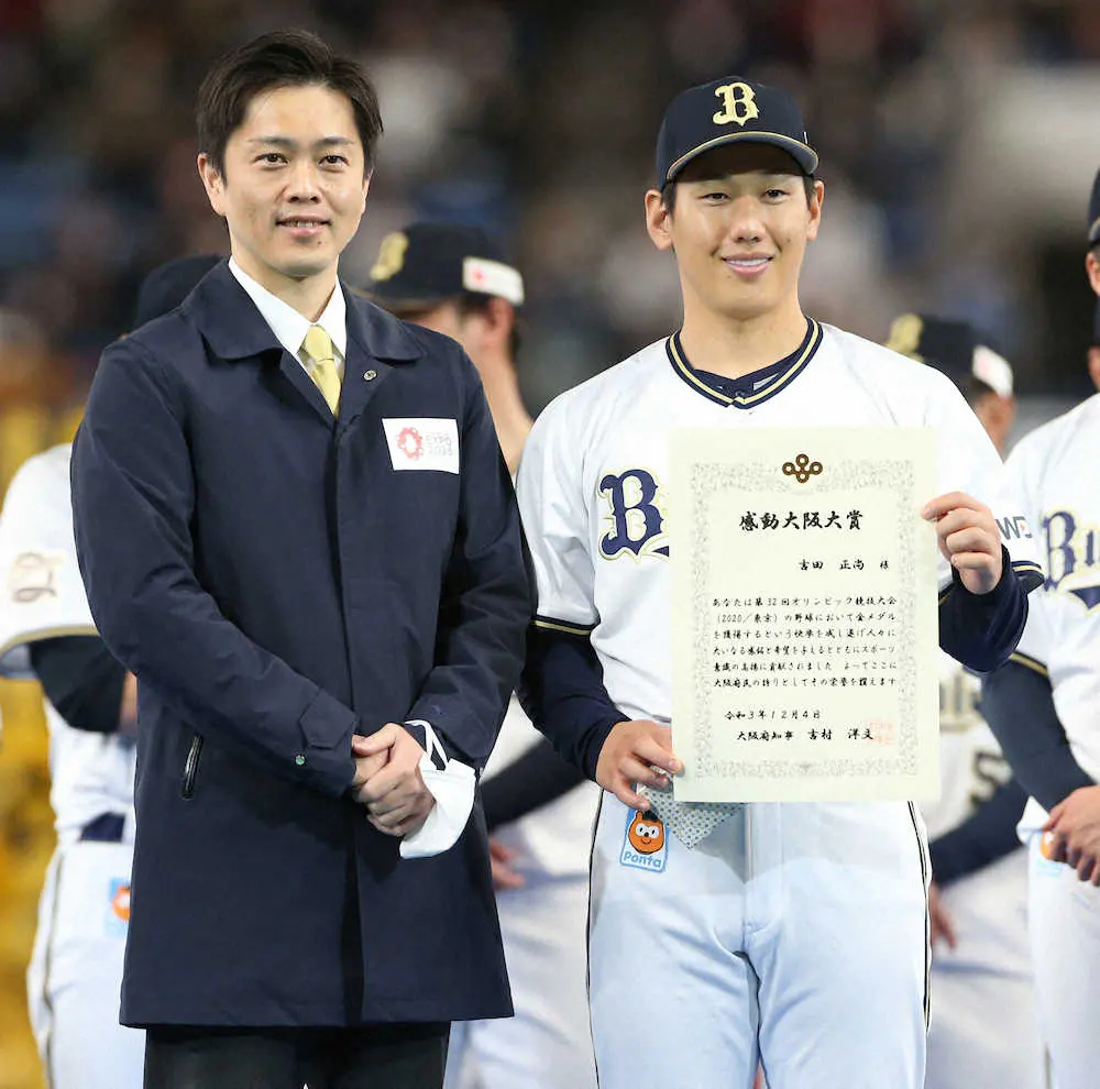 <オリックスファンフェスタ>吉村大阪知事(左)から感動大阪大賞の表彰を受ける吉田正(撮影・北條 貴史)