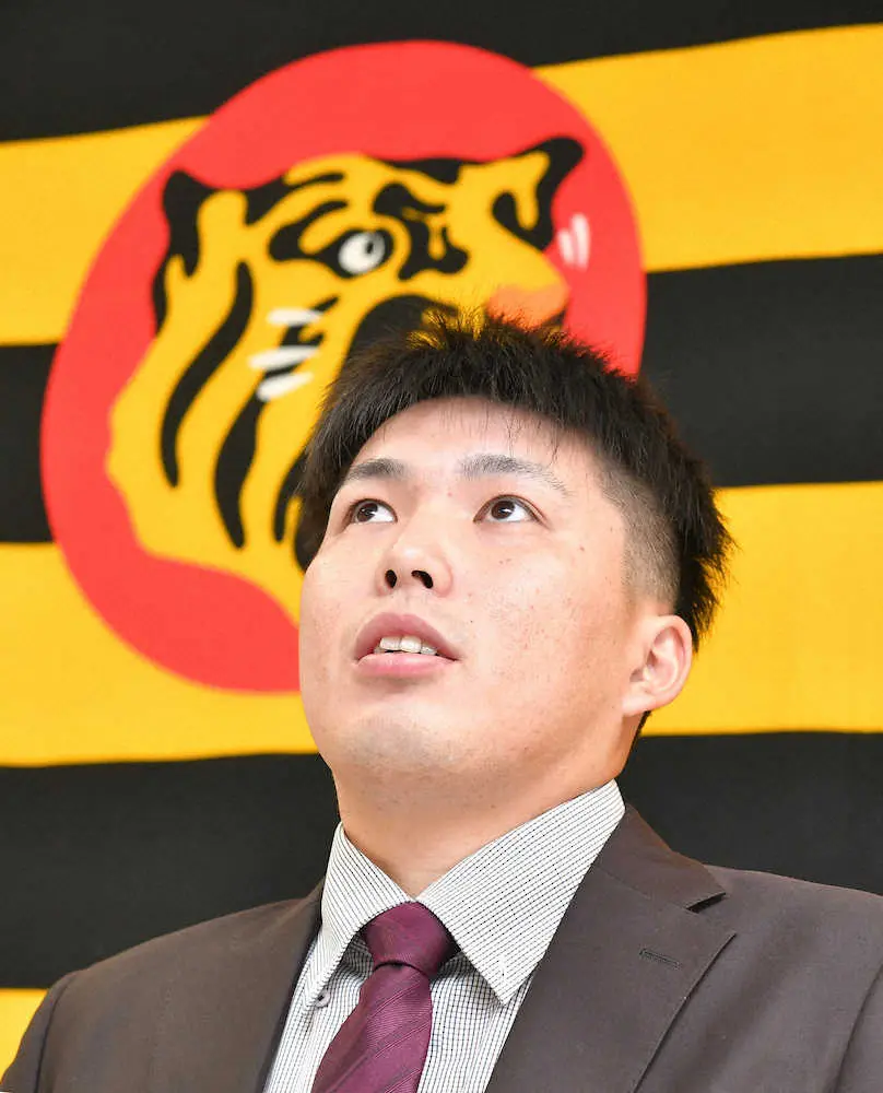 契約更改を終え、会見する阪神・馬場(代表撮影)