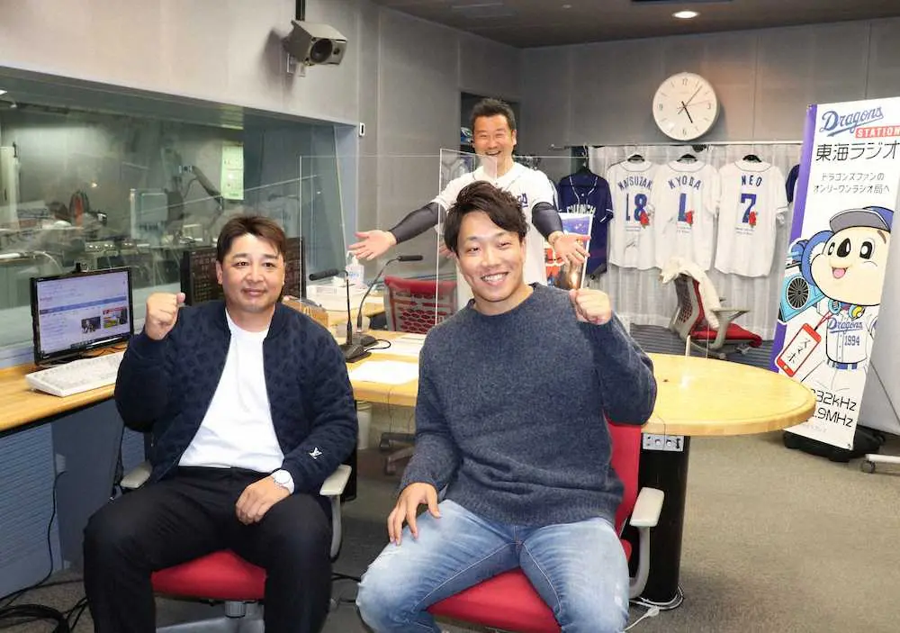 森野打撃コーチ(左)とともに東海ラジオの「大澤広樹のドラゴンズステーション」に出演した中日・柳