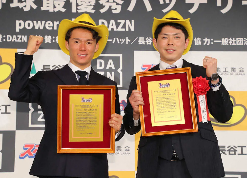 <2021プロ野球最優秀バッテリー賞表彰式> 表彰盾を手に笑顔の木下拓(左)、柳 (撮影・光山 貴大) Photo by スポニチ 中日・柳&木下拓「大変光栄」 オリ由伸&若月は初受賞に歓喜 バッテリ… ギャラリーで見る この記事のフォト 2021年12月14日の画像一覧 もっと見る 2021年12月14日の画像をもっと見る