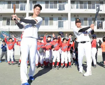 巨人・秋広&菊田が都内小学校で野球教室 来季背番号「55」の秋広は「目標になる選手になれるように」