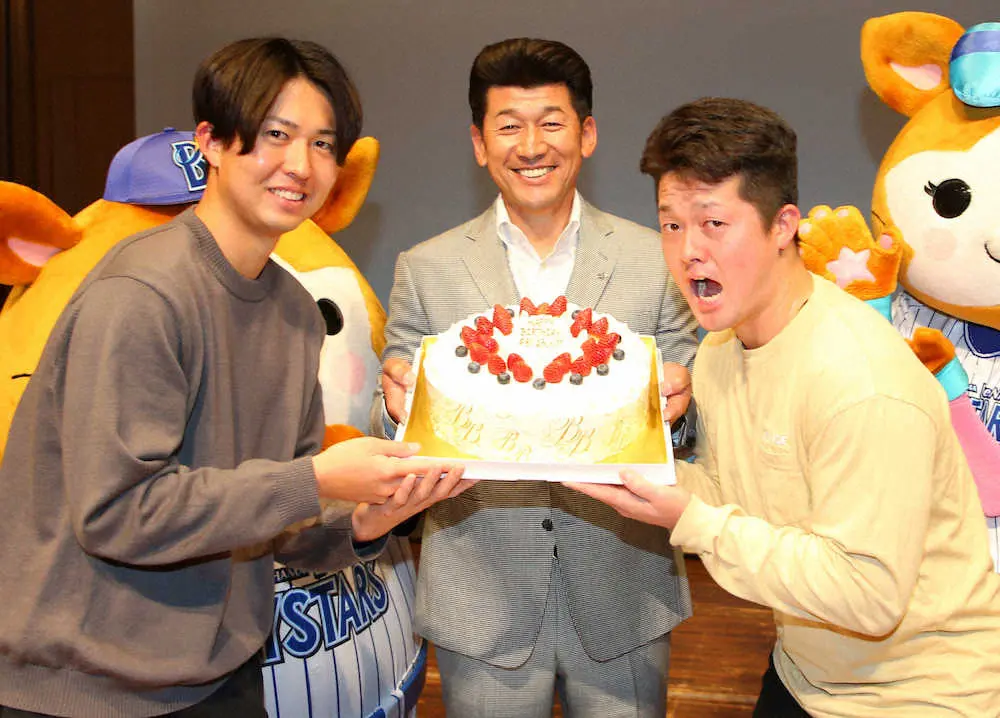 25日に48歳の誕生日を迎える三浦監督(中央)は誕生日ケーキを前に笑顔。左は京山、右は牧(撮影・光山 貴大)