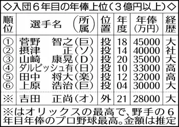 オリックス・山本由伸投手(23)の来季年俸が3億円超えとなることが20日、分かった。入団6年目での大台到達は、巨人・菅野、日本ハム時代のダルビッシュ、楽天・田中将に並ぶ7人目の最速突破。球団ではイチローを抜き史上最速の快挙となる。