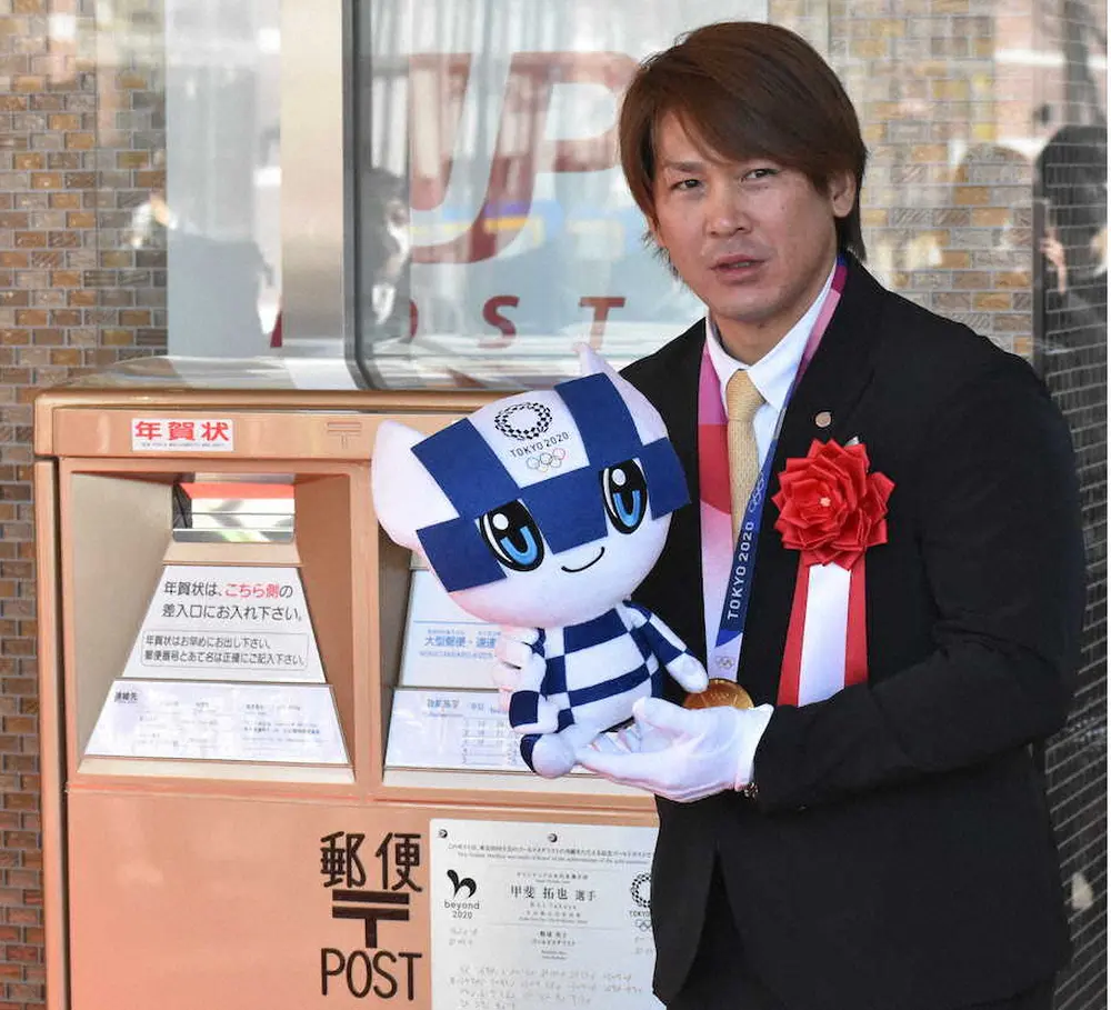 ソフトバンクの甲斐が27日、東京五輪野球での金メダル獲得を称えてJR大分駅前に設置された「ゴールドポスト」の除幕式に出席した。母校・楊志館高に近い駅南口。駅内郵便局の前に設置された。市民はさっそく年賀状を投函。甲斐はにやけていた。