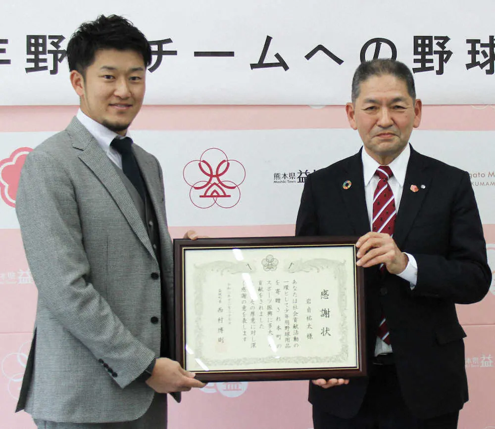 16年に発生した熊本地震で甚大な被害を受けた益城町を毎年訪問し、復興支援と野球振興に取り組んできた左腕。結果、今年は60万円を町民グラウンドへのフェンス設置や小・中学校へのティー打撃用セットなどに充て「町長さんの方からも(フェンスをつけた事で)グラウンドの利用が増えたと。やりがいがあるし、うれしく思います」とうなずいた。