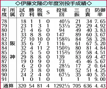 ◇伊藤 文隆(いとう・ふみたか)1954年(昭29)5月11日生まれ、名古屋市出身の67歳。大同工時代は72年ドラフトで中日から5位指名を受けるが拒否。社会人三協精機に進み、77年に阪神からドラフト1位指名を受け、プロ入り。78年4月のヤクルト戦で初勝利。82年には自身最多の10勝を記録。91年に引退。現役通算320試合54勝81敗4セーブ、防御率4.43。背番号は20と14。1メートル82、73キロ(現役時)。右投げ右打ち。