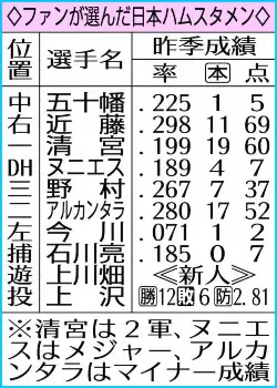 ファンが選んだ日本ハムスタメン Photo by スポニチ 新庄監督「ファンが選ぶスタメン」を公表 「選ばれてない選手 選ばれて… ギャラリーで見る この記事のフォト 2022年01月03日の画像一覧 もっと見る 2022年01月03日の画像をもっと見る