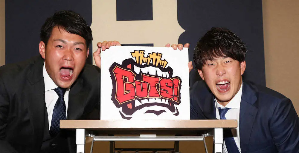今季のキャッチフレーズ「ガツガツGUTS!」顔をする林(左)と小園 (撮影・奥 調)