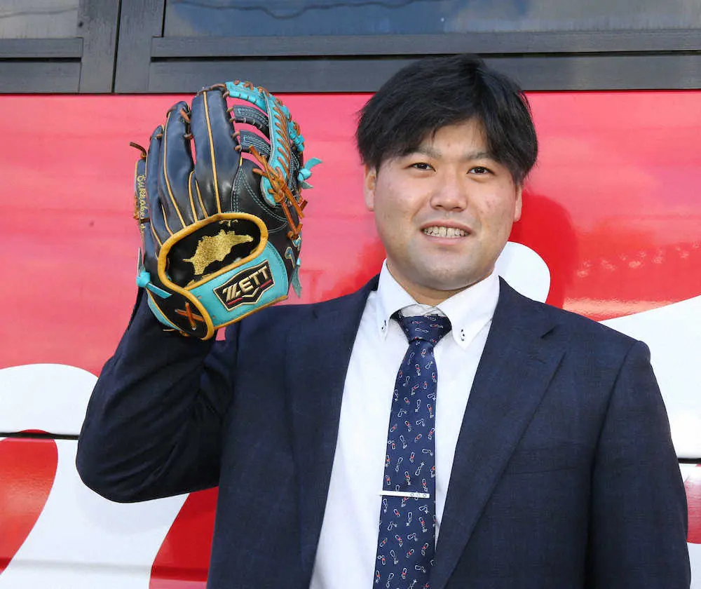香川出身で讃岐うどんをすすりながら恵まれた体格を手に入れた。「うどん屋でぶっかけうどんしか頼まないので。遊び心で入れました」。以前のグラブには「うどん県人」、今回は香川県の形を刺しゅうするなど郷土愛をグラブに入れるのがお決まり。新人11人が自己PR合戦を繰り広げた中、“珍グラブ”を駆使して誰よりも目立つことに成功した。