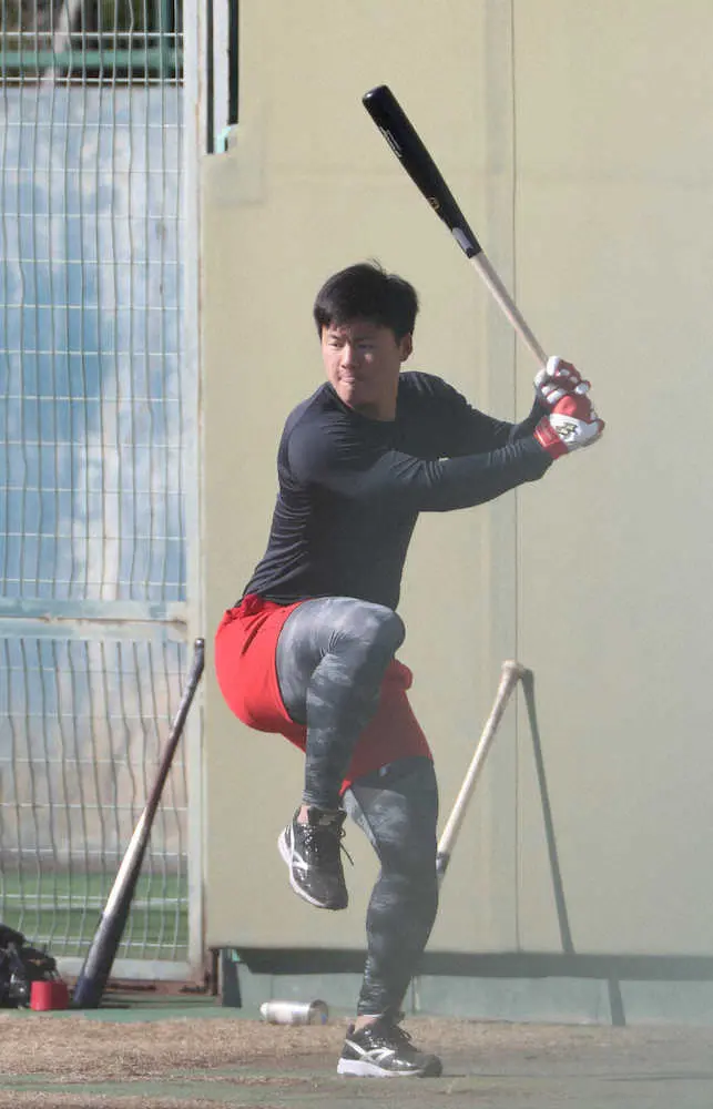 きょう9日から始まる新人合同自主トレの前に屋外で打撃練習をする新人は、見守った畑山統括スカウトが「記憶にない」という異例の調整。一塁ファウルゾーンから中堅方向に打ち込み、52スイング中8本が柵越え。中にはバックスクリーンにドスン!と直撃する豪快な一撃もあった。