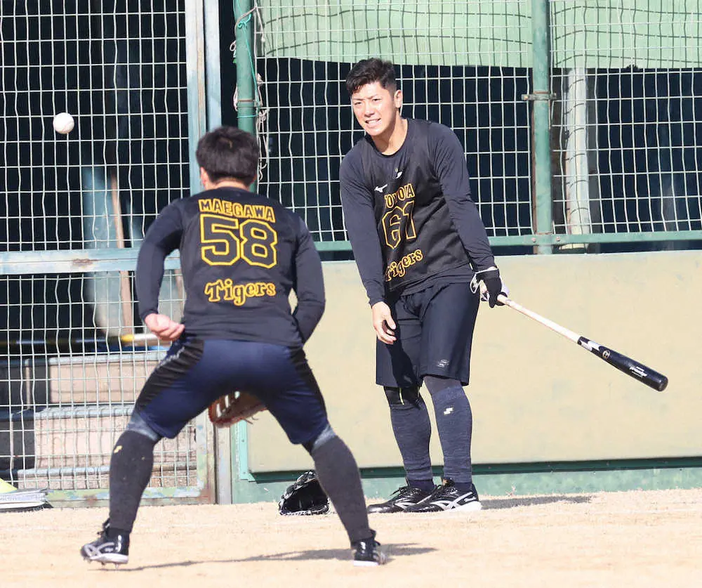 <阪神 新人合同自主トレ> ペッパーをする豊田(右) (撮影・平嶋 理子)