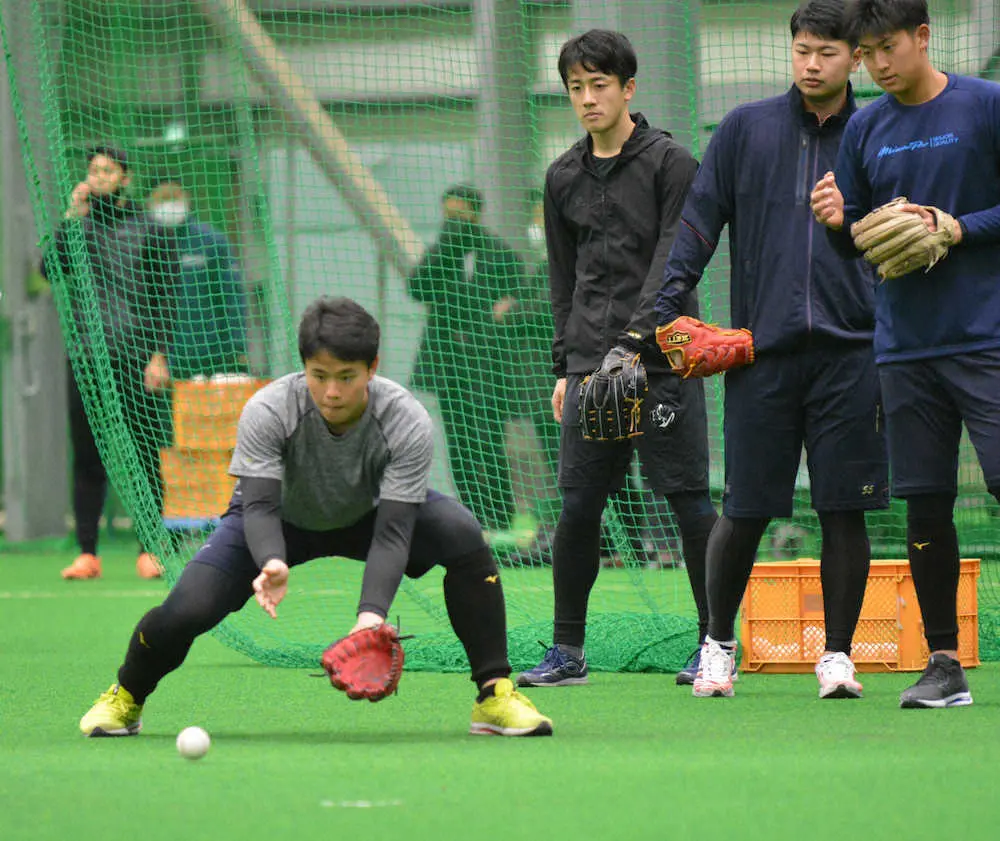 この日は雨天のため室内練習場で汗を流した。中学3年時にU―15日本代表でW杯に出場し、中京大中京では3年春のセンバツで4強入り。高校からの入団ではあるが、世代を代表する投手の一人として1年目からアピールするつもりで「同級生に負けるわけにはいかない。横一線のスタートなので、ここからは自分らしさを出していきたい」と強く誓う。