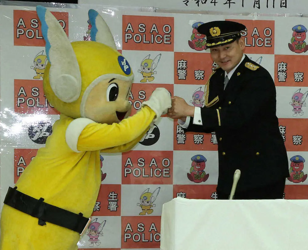 麻生警察署のマスコットのピーガルくん(左)にグータッチで迎えられる丸(撮影・森沢裕)