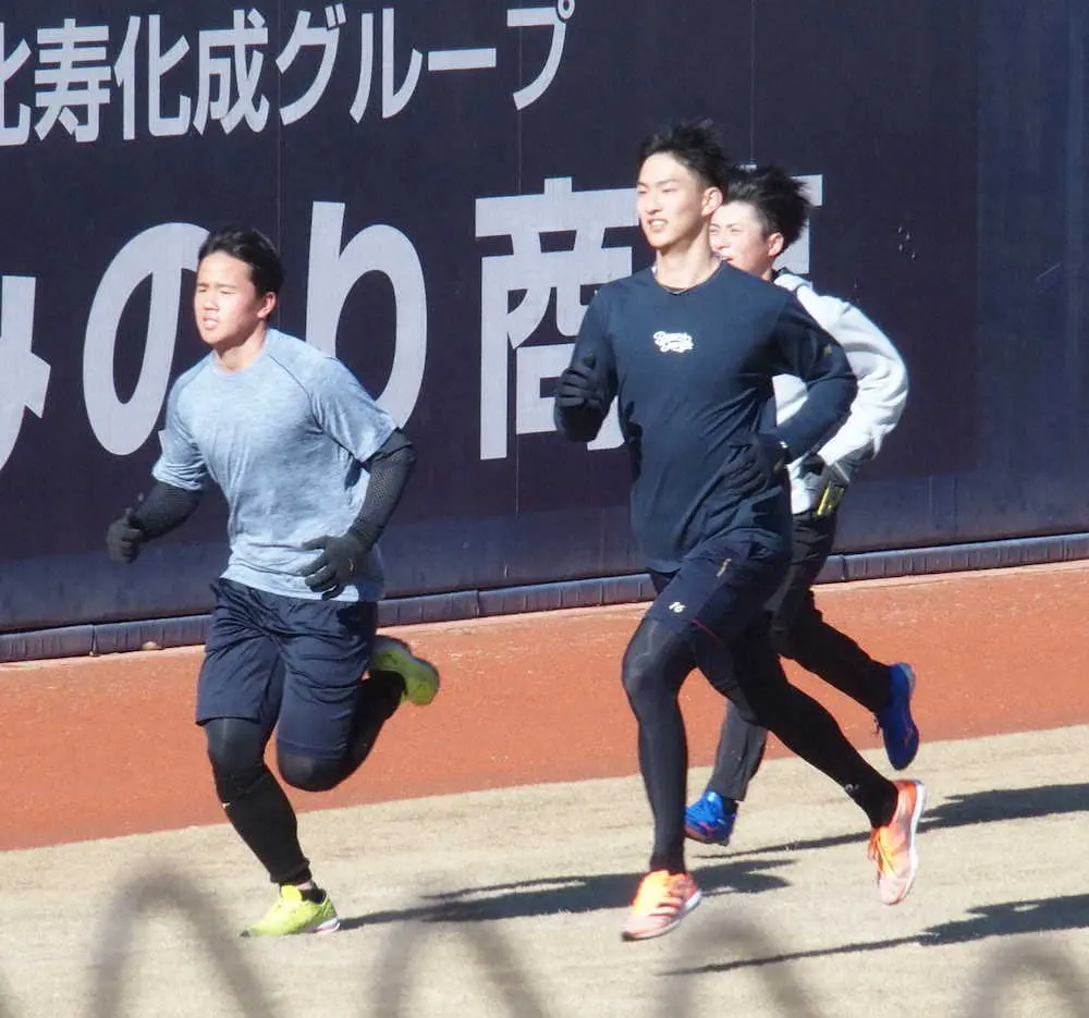 新人合同自主トレで畔柳(左)、上川畑(右後)とともにランニングを行う日本ハム・達