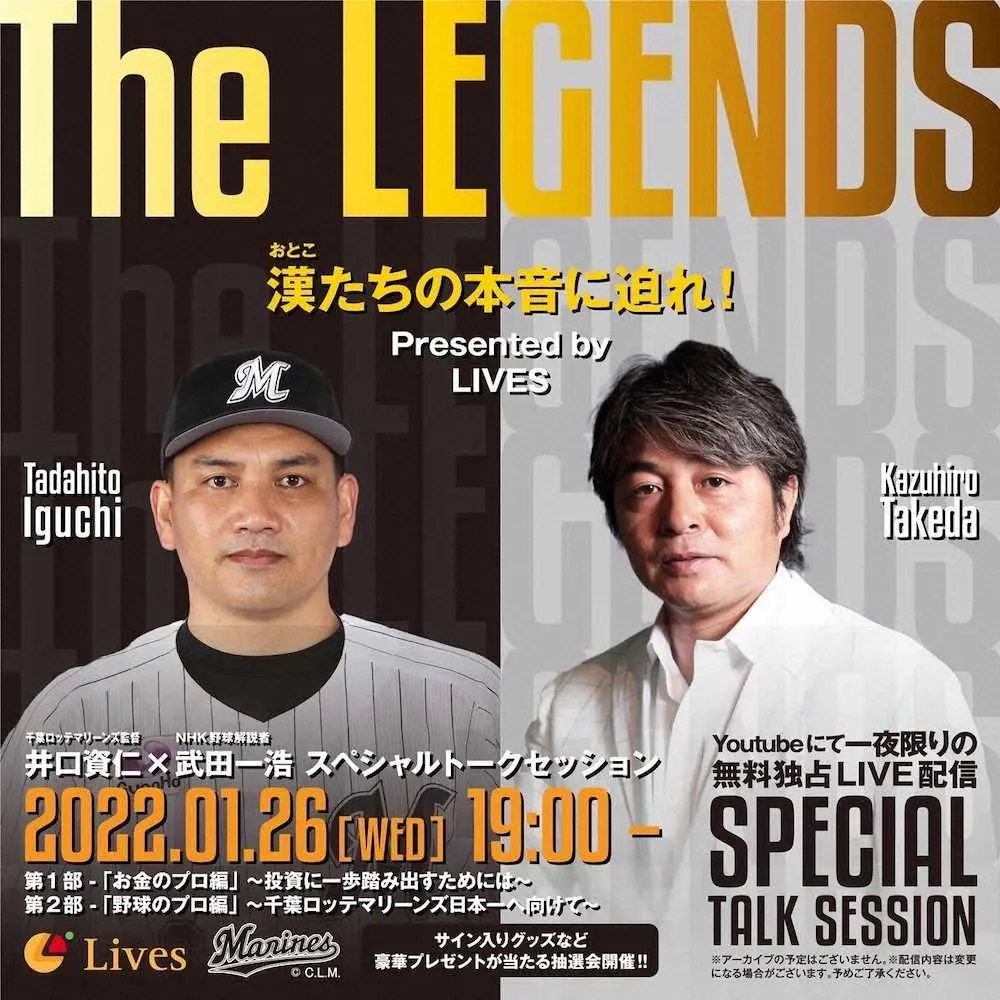 ロッテ・井口資仁監督と野球解説者・武田一浩氏のオンライントークイベントが1月26日午後7時から開催される。