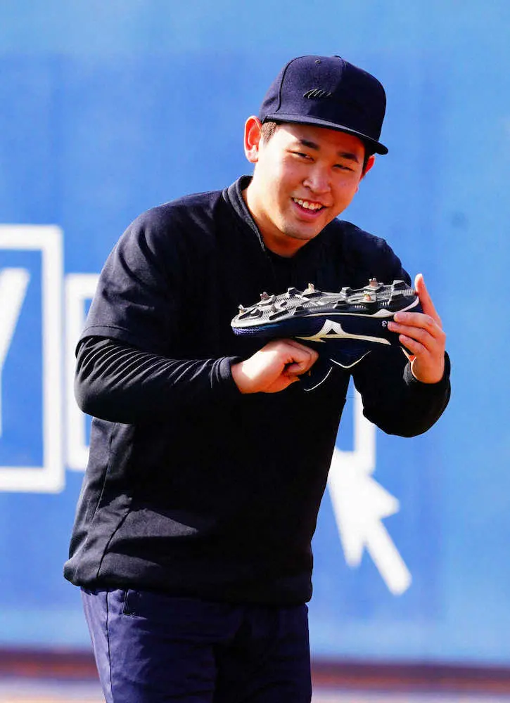 スパイクに履き替え笑顔をみせるオリックス・宮城(撮影・井垣 忠夫)