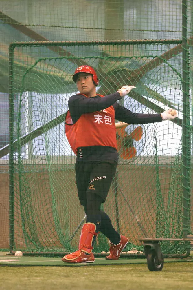 広島ドラフト6位の末包(すえかね=大阪ガス)が大野練習場の室内で新年“初打ち”に汗を流した。他の新人野手とローテーションでカーブを交えたマシン打撃に約10分間。大砲候補は苦笑しきりだった。