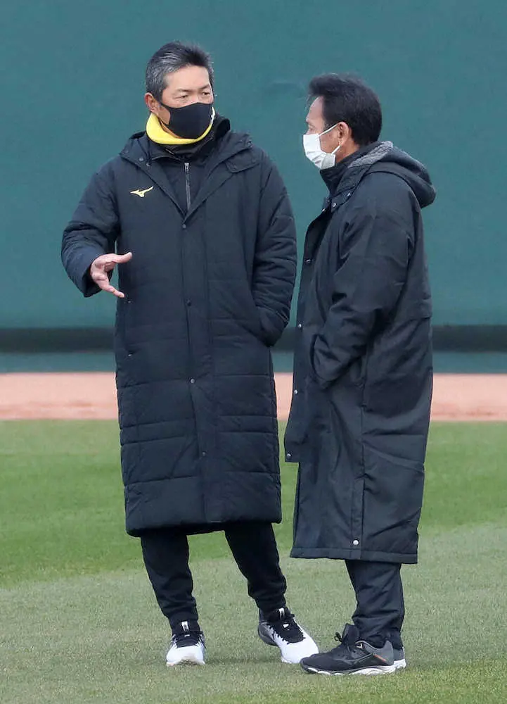 小川3軍監督(右)と話をするソフトバンク・小久保2軍監督(撮影・中村 達也)