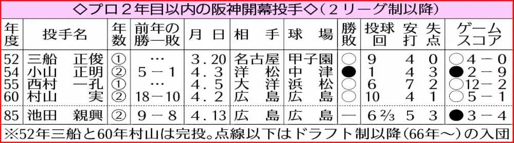 プロ2年目の85年に開幕投手を務めた阪神・池田親興 阪神・伊藤将が開幕名乗り プロ2年目は85年・池田親興以来 “能見の教え”… ギャラリーで見る この記事のフォト 2022年01月26日の画像一覧 もっと見る 2022年01月26日の画像をもっと見る