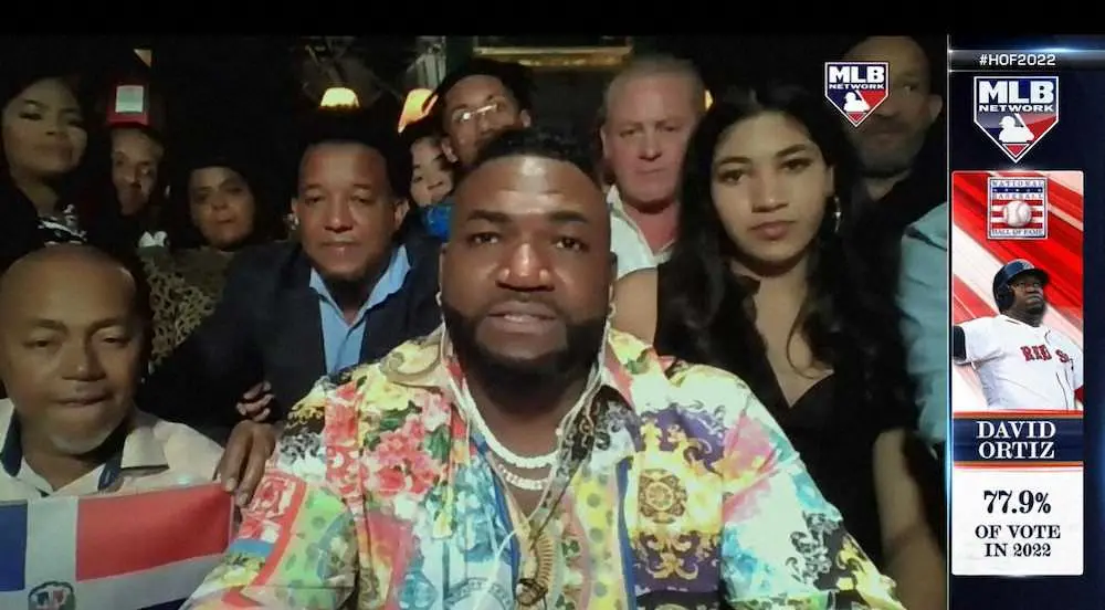 米野球殿堂入りの喜びを語るデービッド・オルティス氏(中央)。左後ろは元同僚のペドロ・マルティネス氏(MLBネットワークから)
