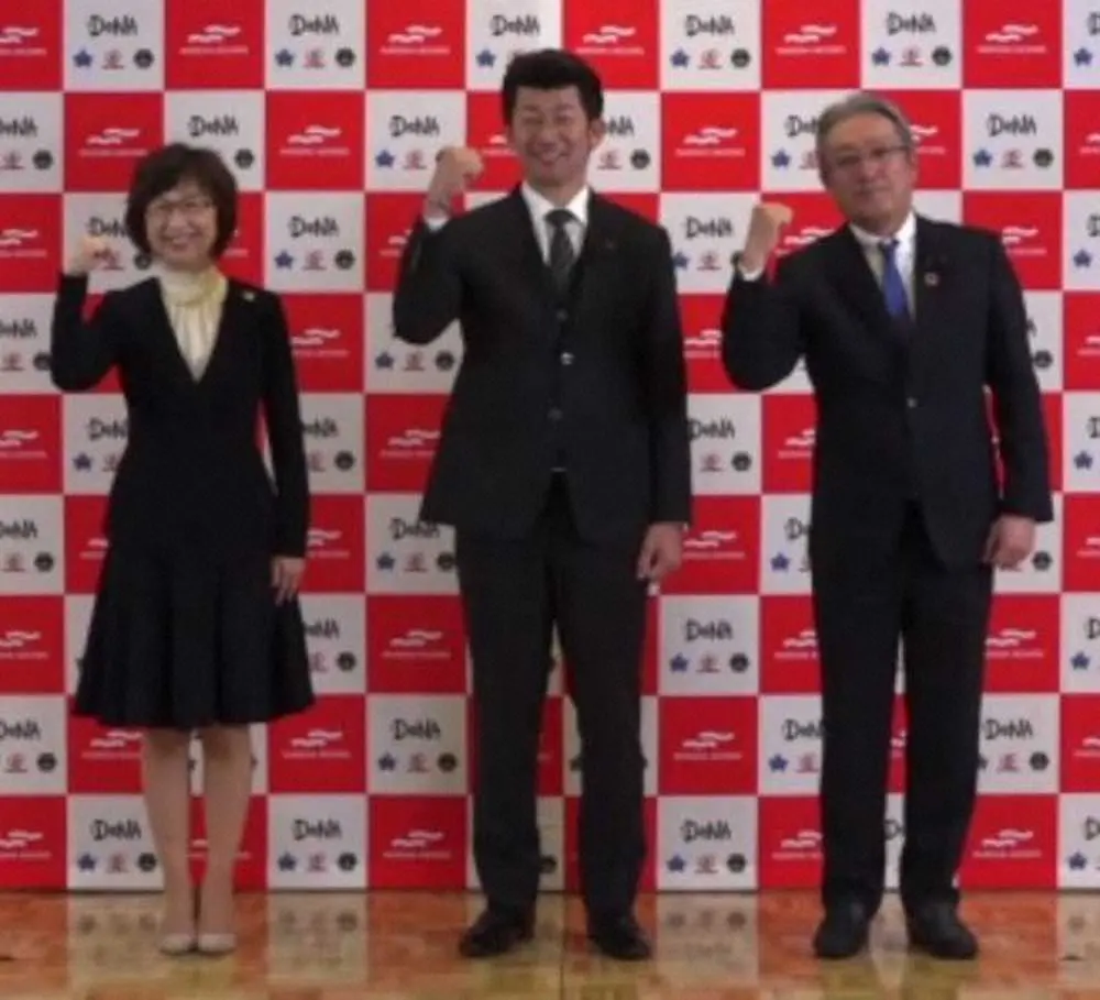 共同記者会見で記念撮影する左から南場会長、三浦監督、池見社長