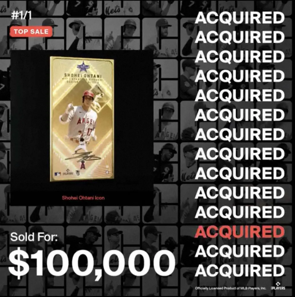 NFT企業キャンディ・デジタルが15日にオープンしたばかりのMLBマーケットで販売したもので、大谷のサイン入りで複製不能なことが証明されたカード型のデジタルデータ。同社はツイッターで「NFT野球部門の史上最大の販売」と投稿した。これまではパドレスのスター遊撃手タティスの2万ドル(約230万円)だった。