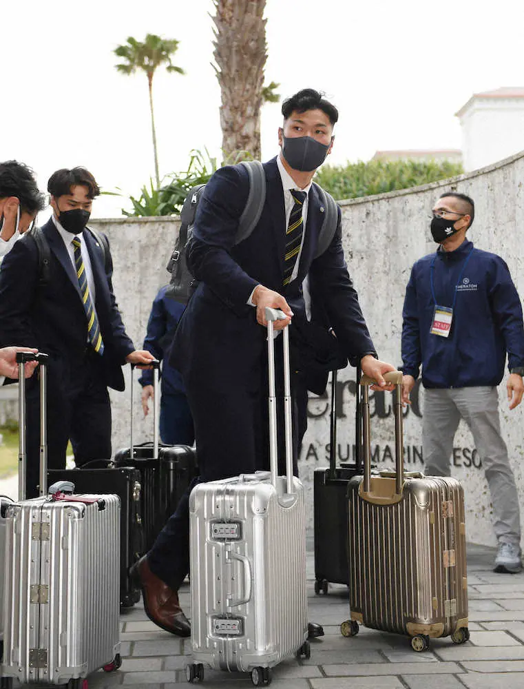 阪神の先乗り合同自主トレに参加する選手らが28日、沖縄入りした。2年目を迎える佐藤輝は初めて迎える有観客キャンプを心待ちにした。