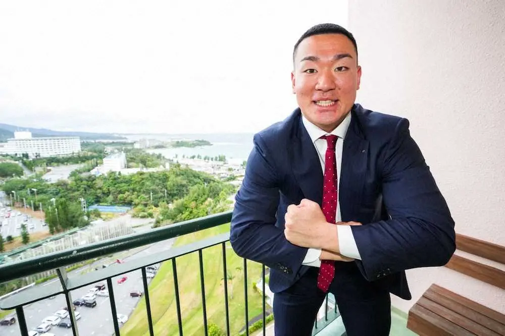 中3夏の家族旅行以来となる沖縄。30日の最高気温は約20度で、宿舎の自室から見える美しい海に自然とテンションも上がる。キャンプインに合わせて髪形はサイドを刈り上げトップ部分にパーマをかける最新スタイルでバッチリ決めてきた。沖縄では計10試合が予定されており、「東北のゴジラ」は「各チームのエースとやってみたい」と鼻息が荒かった。(重光 晋太郎)