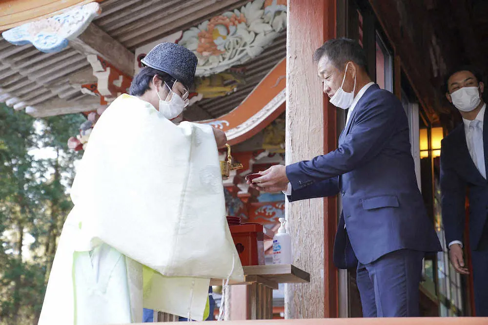 無事息災祈願のため榎原神社を参拝した西武・辻監督(球団提供)