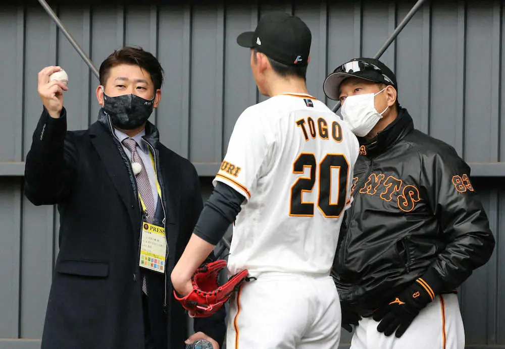 その後はブルペンに移動。松坂さんは原監督とともに捕手の後ろ、さらには投げている投手の後ろから投球練習を見守り、戸郷にはスライダーの握り、投げ方などをアドバイスするシーンもあった。