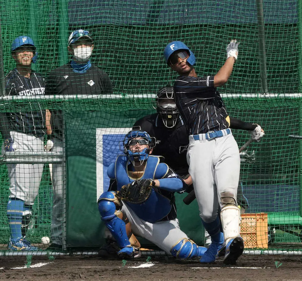 5スイング目にはバックスクリーン直撃の弾丸ライナーの一発。3スイング目は右翼フェンス直撃でわずかに届かなかったが、この日放った3本は、いずれも本塁打性の当たりだった。これには大リーグのメッツ、ジャイアンツでプレーした新庄監督も「彼はザ・メジャーリーガー」と、目を丸くしながら絶賛した。