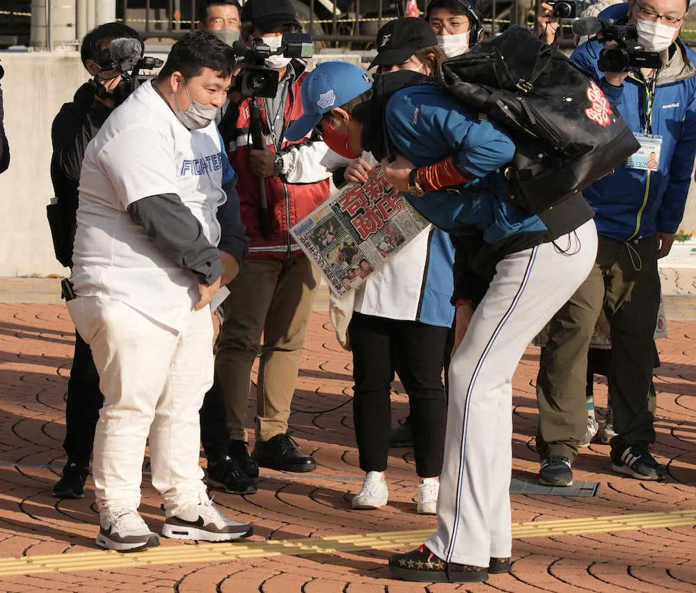 日本ハム・新庄監督が18年ぶりの再会を果たした。現役時代の04年に名護キャンプで放った柵越え弾が地元小学生の股間を直撃。その当事者で「チン太」のニックネームが定着してしまった亀里涼太さん(28)が、この日に「I AM チン太」の横断幕を持参して来場した。球場入りの際に声を掛けられ「あっ!あの当時の!」と目を丸くし、握手も交わした。