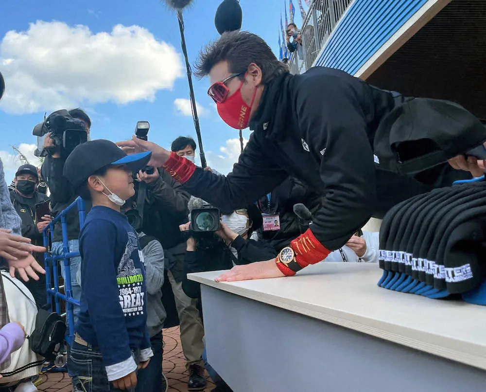 (キャンプ帽 子供に手渡しプレゼント/) 【本日の“やさ”しんじょう】キャンプ初の日曜日とあり、キャンプ地には上限いっぱいの2500人が来場。「ファンは宝物」という新庄監督の発案で、で球団のキャンプ帽子100個を直接手渡しでプレゼントした。