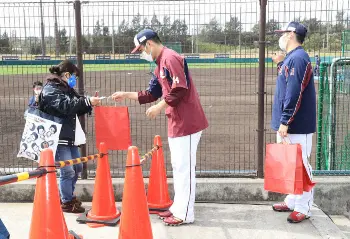 今年のキャンプは2年ぶりに有観客で開催されているが、ファンが見学できるエリアは大きく制限されている。「よりキャンプを楽しんでもらいたい」という思いから、プレゼント企画を実施。則本昂大投手と松井裕樹投手が練習の合間にファンの観覧エリア(三塁側芝生席)にサプライズ登場し、計4人にキャップを手渡しした。